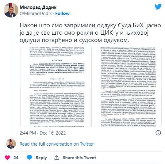 "Nakon što smo zaprimili odluku Suda BiH, jasno je da je sve što smo rekli o CIK-u i njihovoj odluci potvrđeno i sudskom odlukom. Odlukom su uvaženi svi argumenti SNSD-a", naveo je Dodik na Tviteru gdje je objavio odluku Suda BiH.